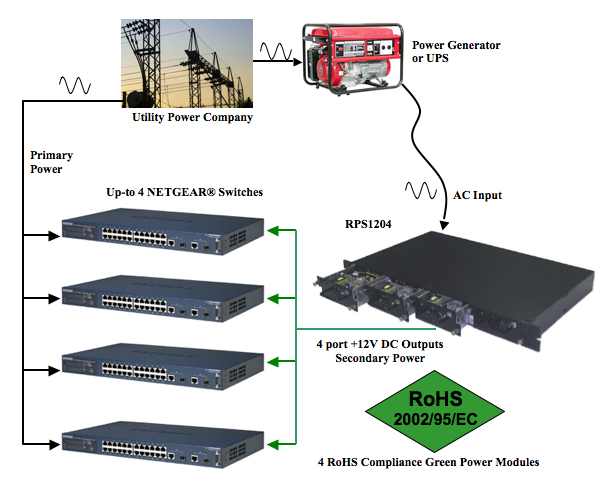 The Model RPS1204 is a HOT-SWAP 1U rack mountable RPS (Redundant power supply) system. The RPS has 4 modules each capable of supporting a NETGEAR switch. The unique HOT- SWAP capability of RPS1204 gives the end user flexibility to change the configuration in field.